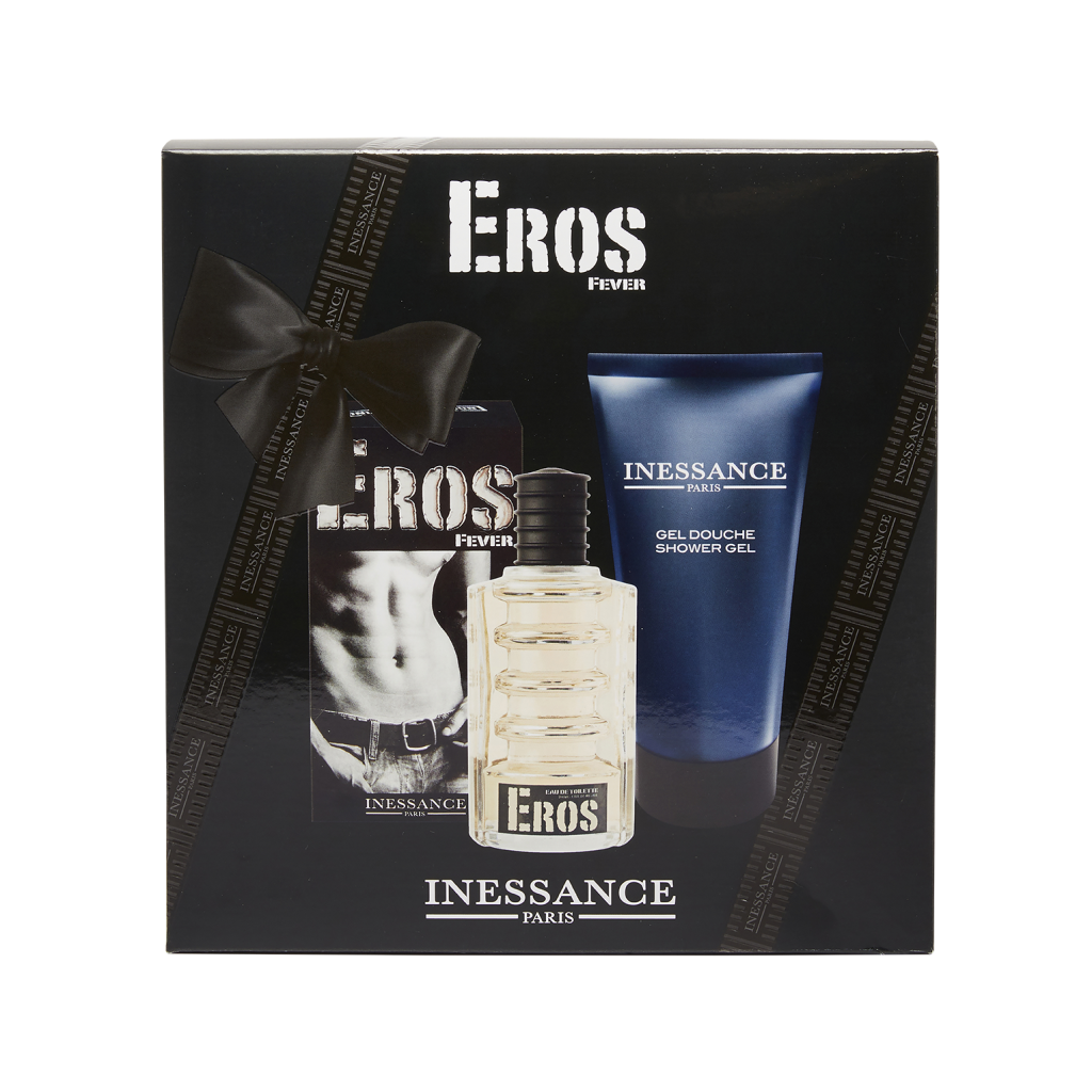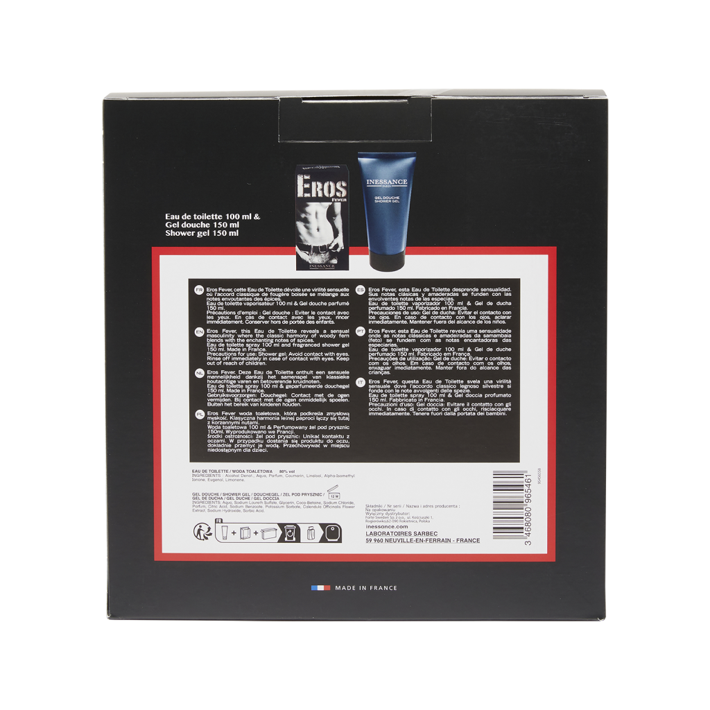 Le coffret Eros Fever de Inessance contient une Eau de Toilette 100ml et un Gel Douche Corps & Cheveux 150ml: