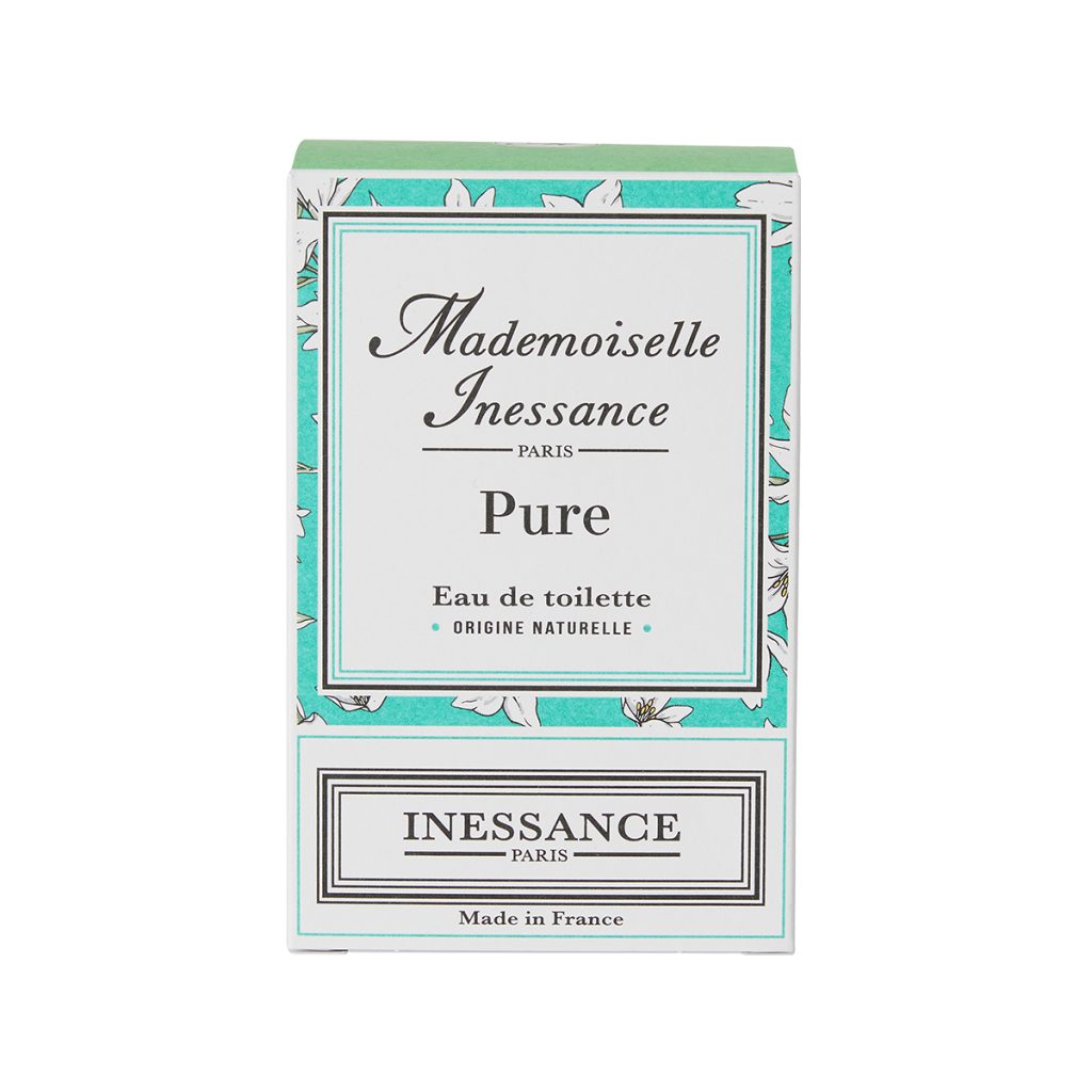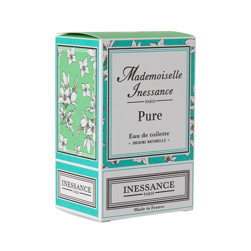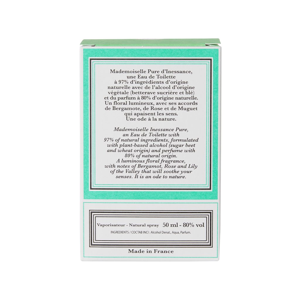 Mademoiselle Pure d’Inessance, une Eau de Toilette à 97% d’ingrédients d’origine naturelle avec de l’alcool d’origine végétale (betterave sucrière et blé) et du parfum à 80% d’origine naturelle. Un floral lumineux, avec ses accords de Bergamote, de Rose et de Muguet qui apaisent les sens. Une ode à la nature.