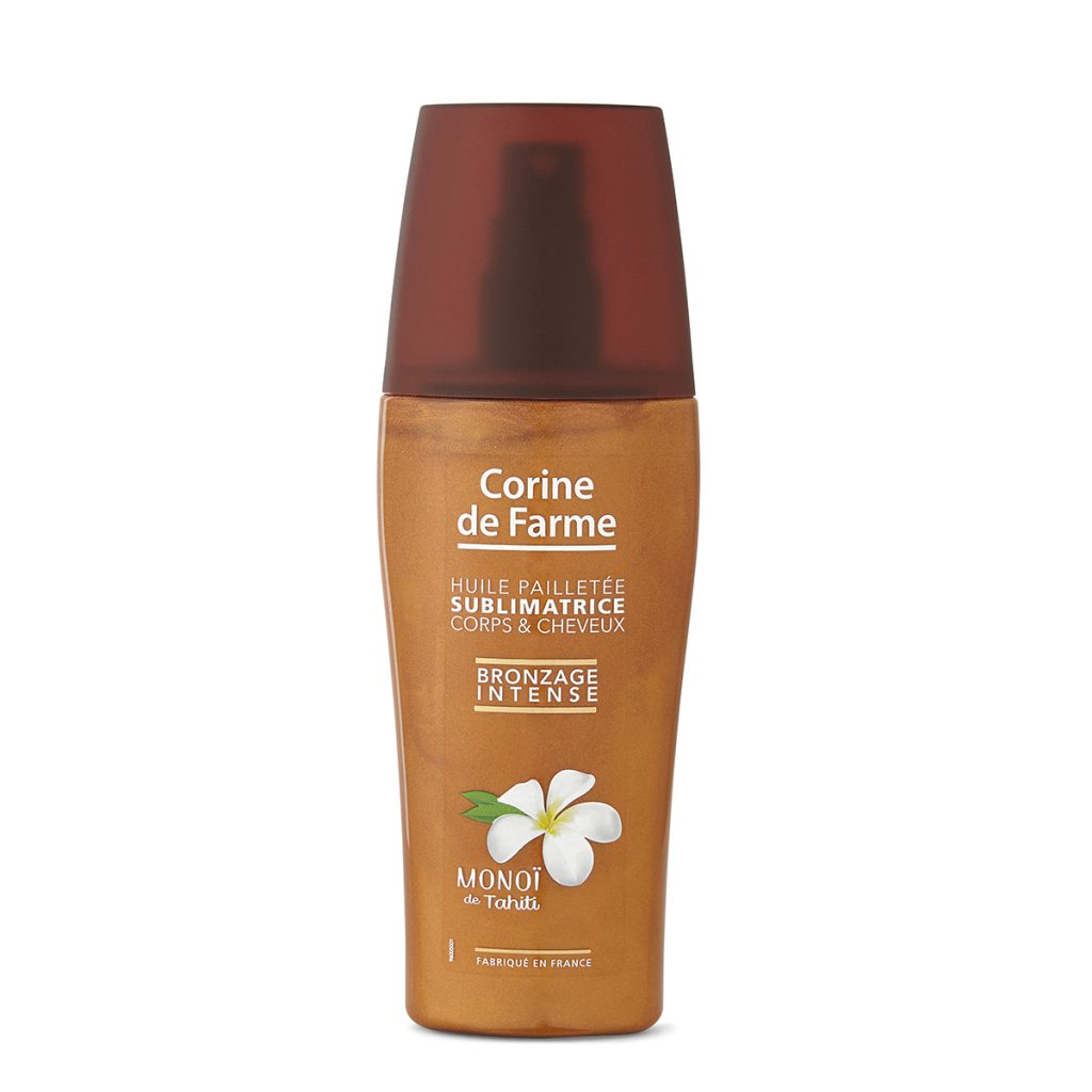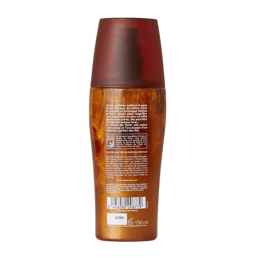 L’huile pailletée sublime votre peau et vos cheveux de reflets irisés et procure un bronzage intense et doré.