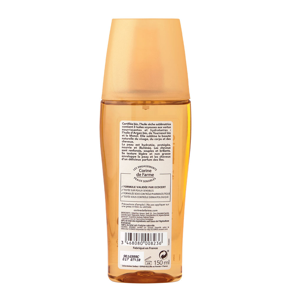 Certifiée bio, l’huile sèche sublimatrice contient 3 huiles précieuses aux vertus nourrissantes et hydratantes : l’huile d’Argan bio, l’huile de Tournesol bio et le Monoi. Multi-usage : elle sublime la beauté naturelle du visage, du corps et des cheveux.